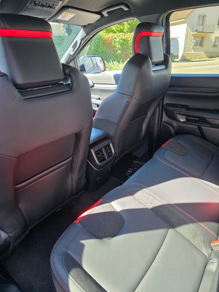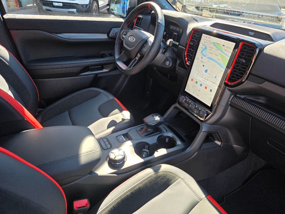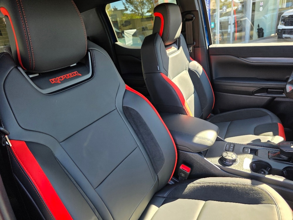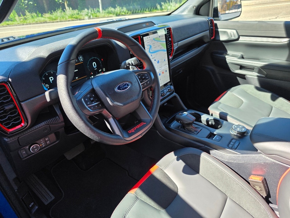 • Lenkrad: Raptor-Lederlenkrad, 3-Speichen-Design, mit Ziernähten in Rot